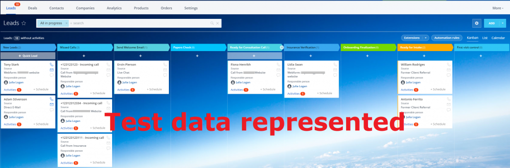 * Each lead card represents an Inquiry. External appearance (on a screenshot) is fully adjustable. Similarly, Internal appearance can include any required information about your Leads - from names and personal information to uploaded documents and meeting details. Contact us to ask how.